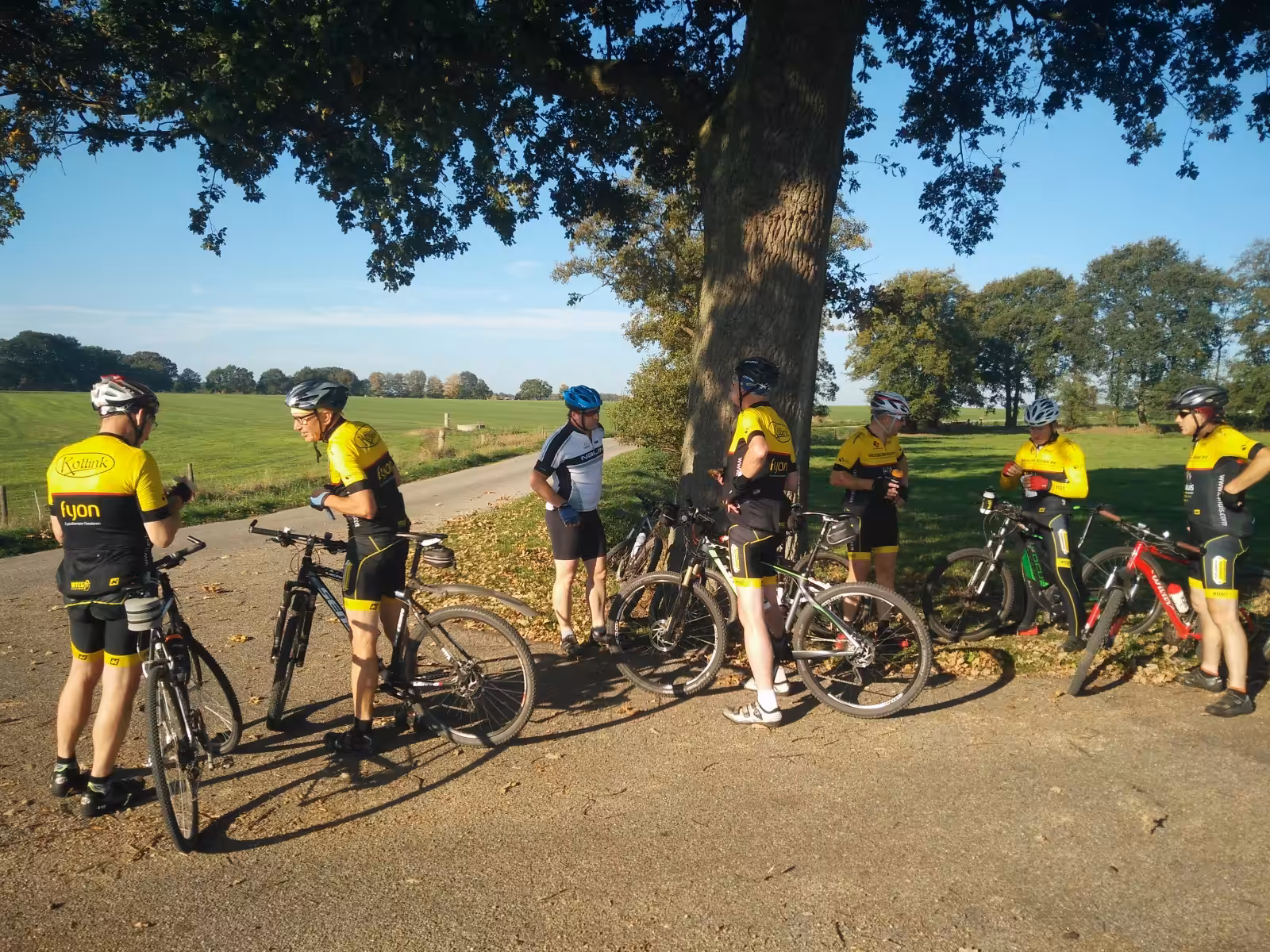 Veel leden meldden zich deze fraaie zondagochtend op het plein bij Kottink voor de aftrap van het winterseizoen. Ook dit weekend blonk weer uit in wat de zomer van 2018 al maanden doet: zon en hoge temperaturen. Hier krijg je nou niet bepaald een wintergevoel bij, maar daar hoorde niemand je niemand over klagen 🙂